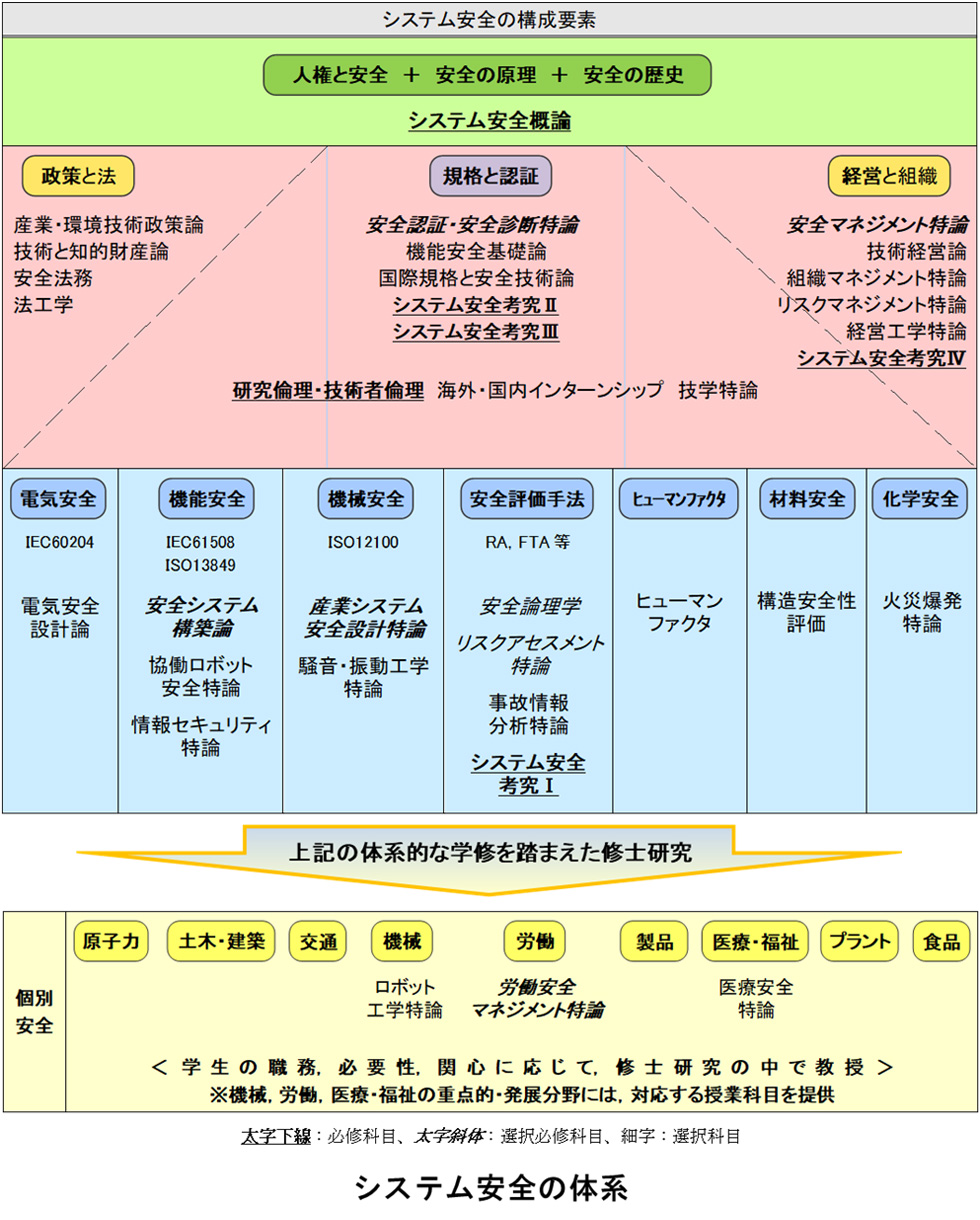 - 安全の最先端の知識と高い倫理観を有し,安全技術とマネジメントスキルを統合して応用するシステム安全の考え方を身に付け,それを各種解析に適用しつつ研究及び実務に応用実践できる体系的な専門基礎力を涵養するため,政策・経営,規格・認証,及び安全技術の各分野からなる講義を実施する.(選択必修科目)